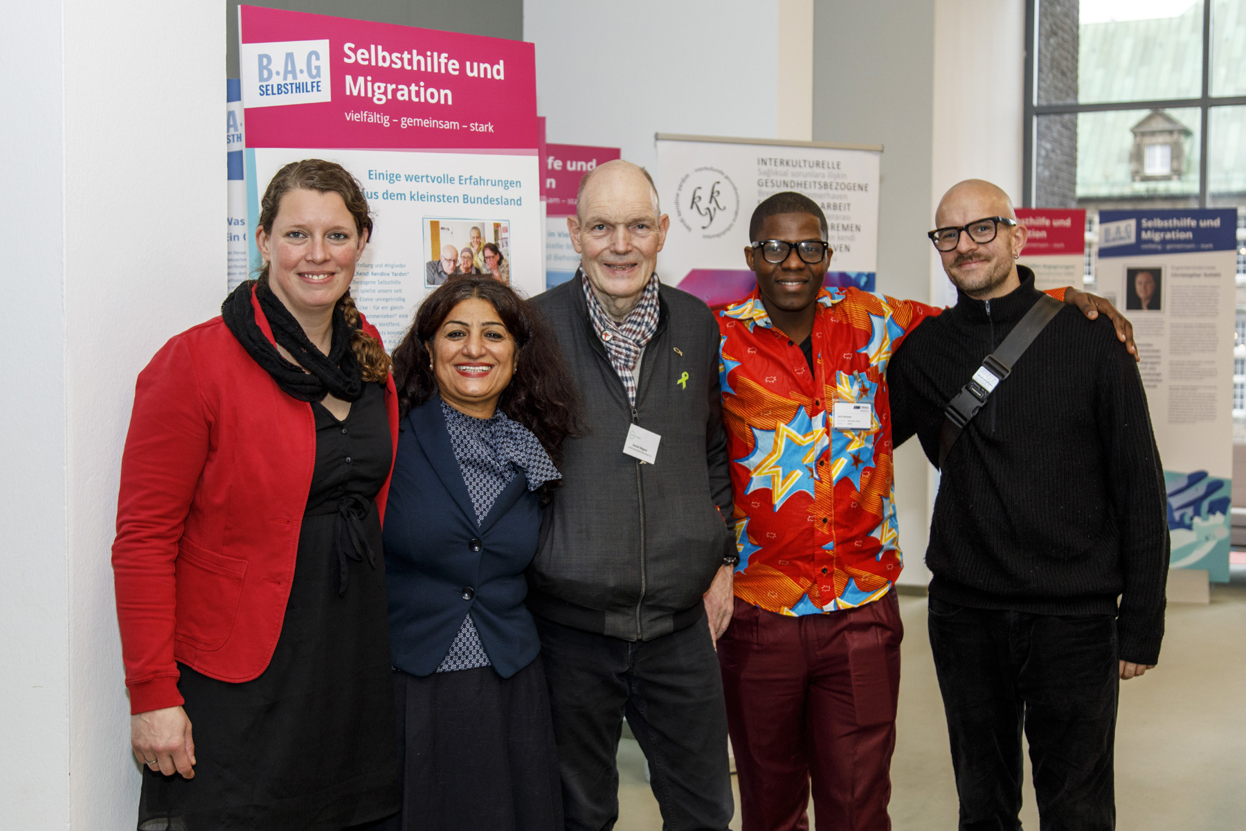 Gruppenbild in der Ausstellung: Katja Kähler, Sahhanim Görgü-Phillipp, Gerald Wagner, Mamadou Balde, Marius Schlichting